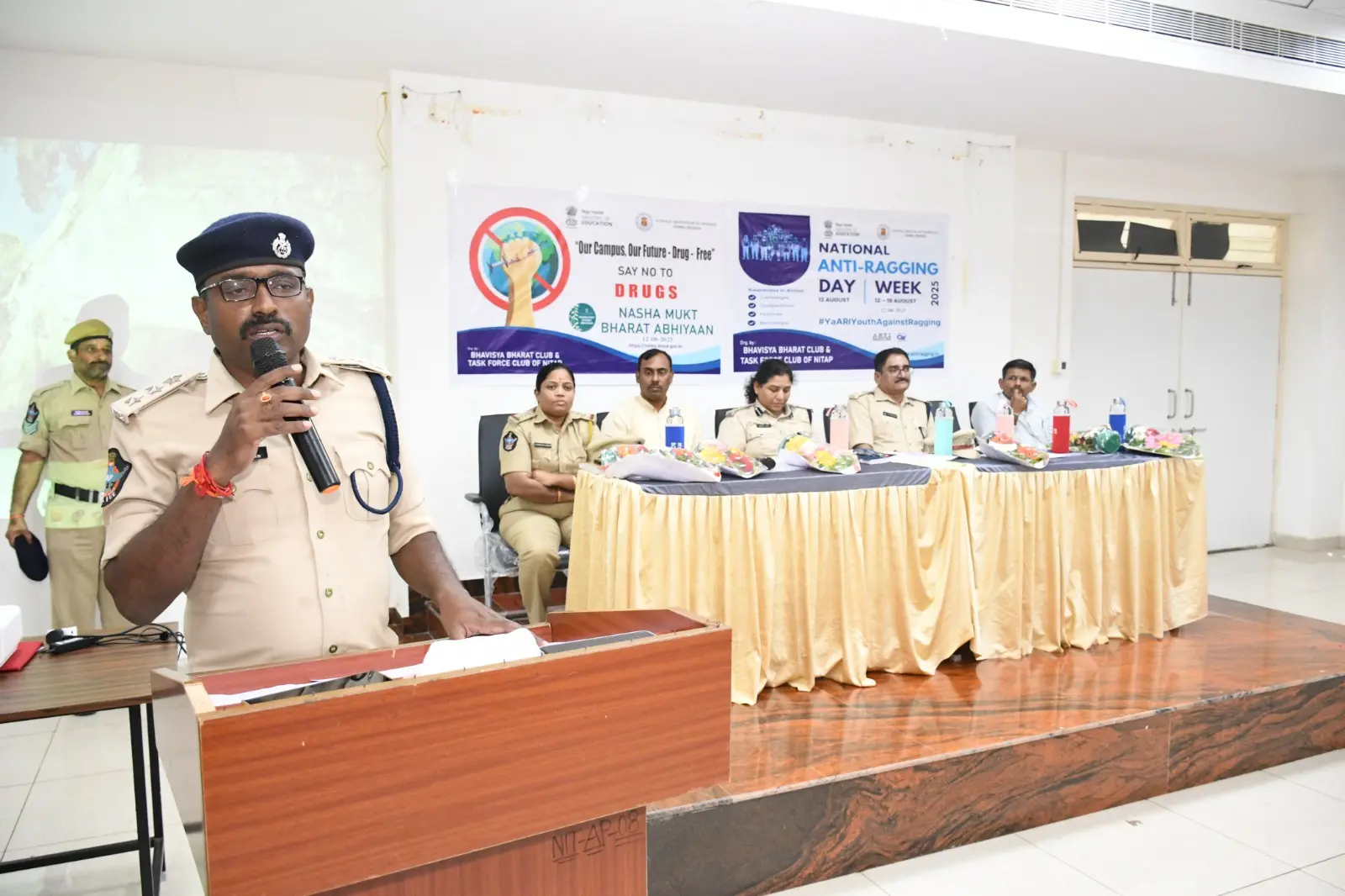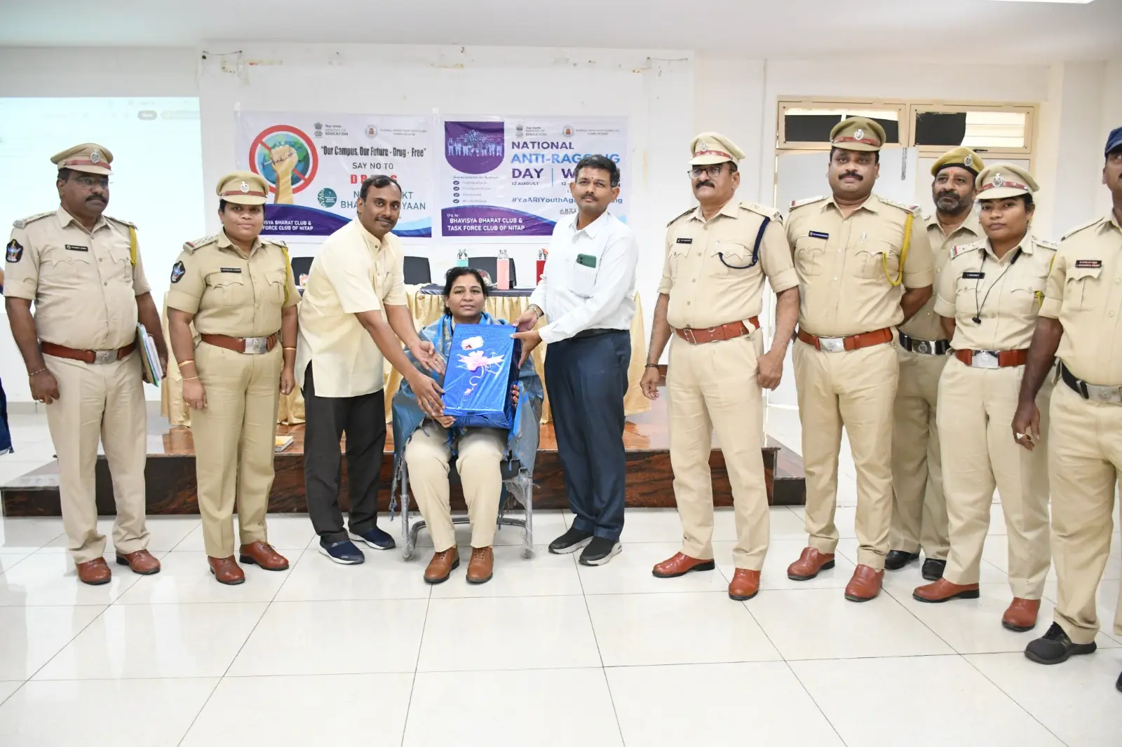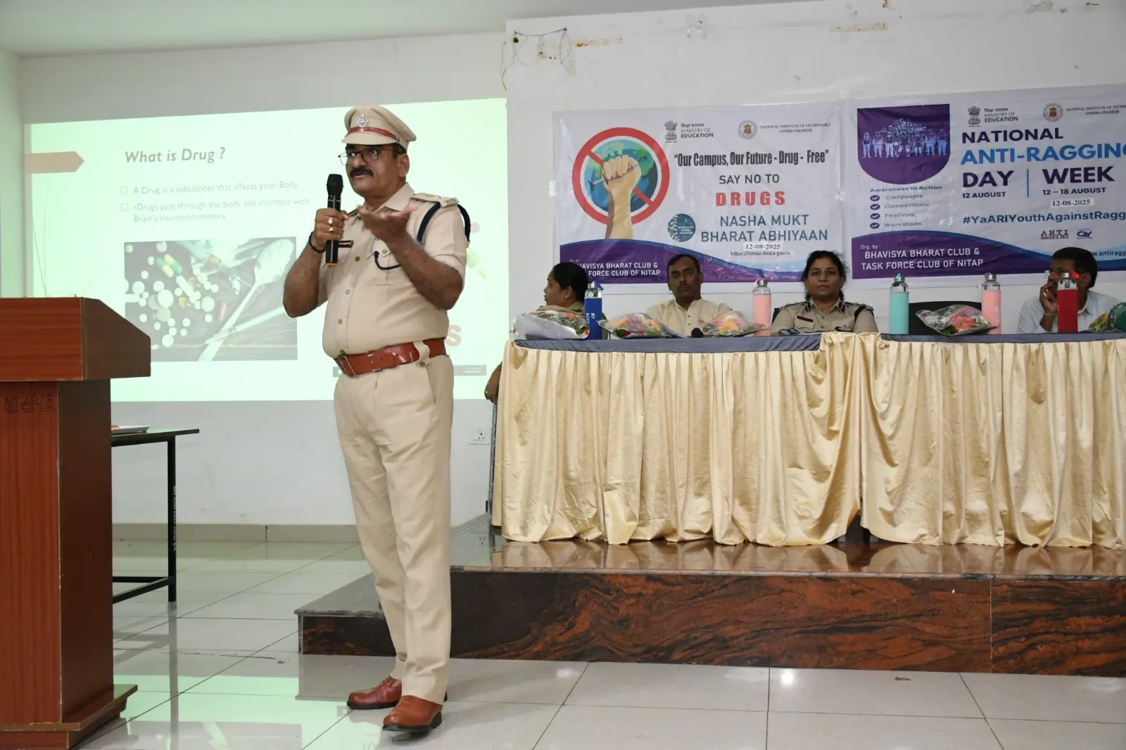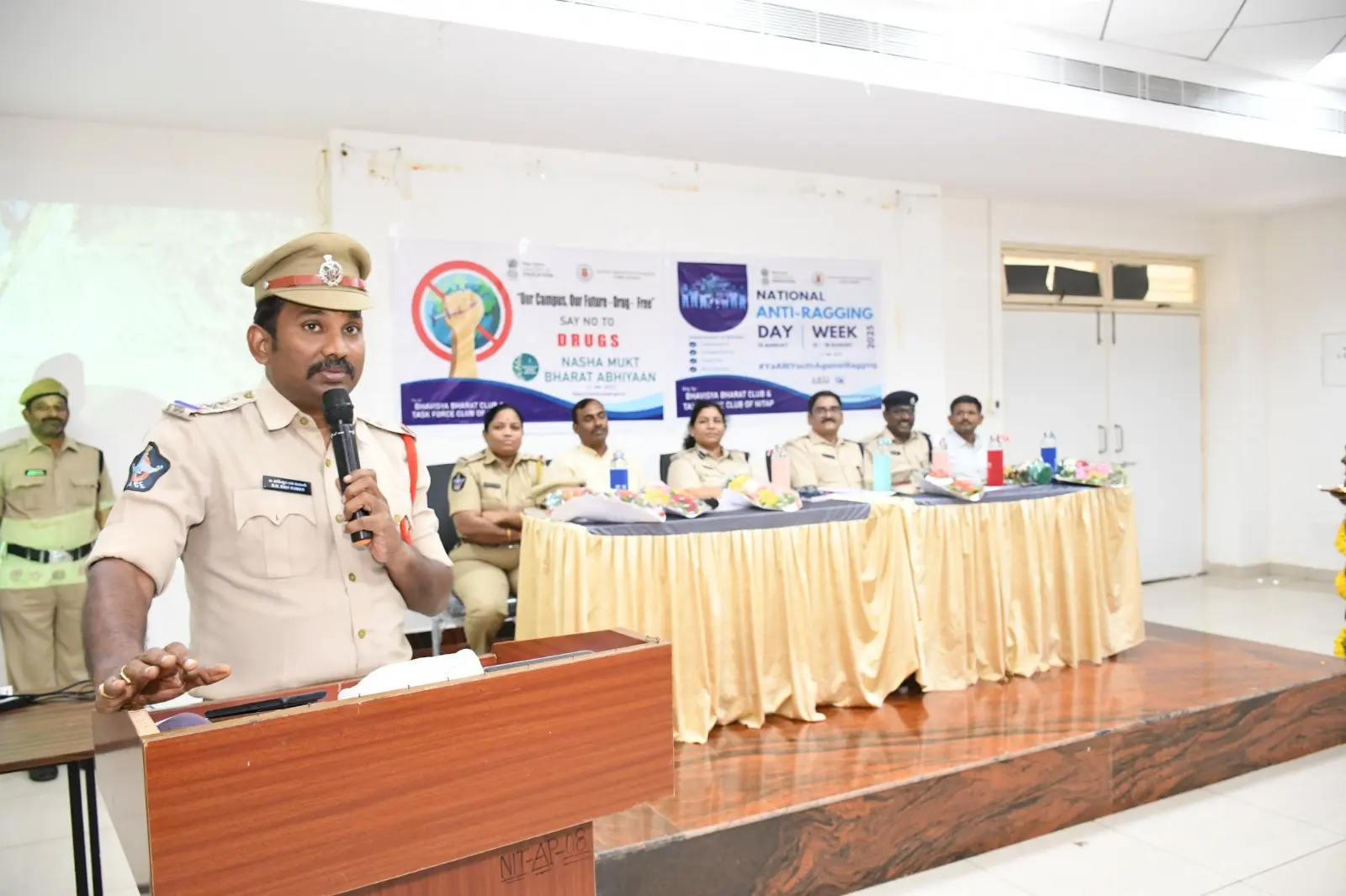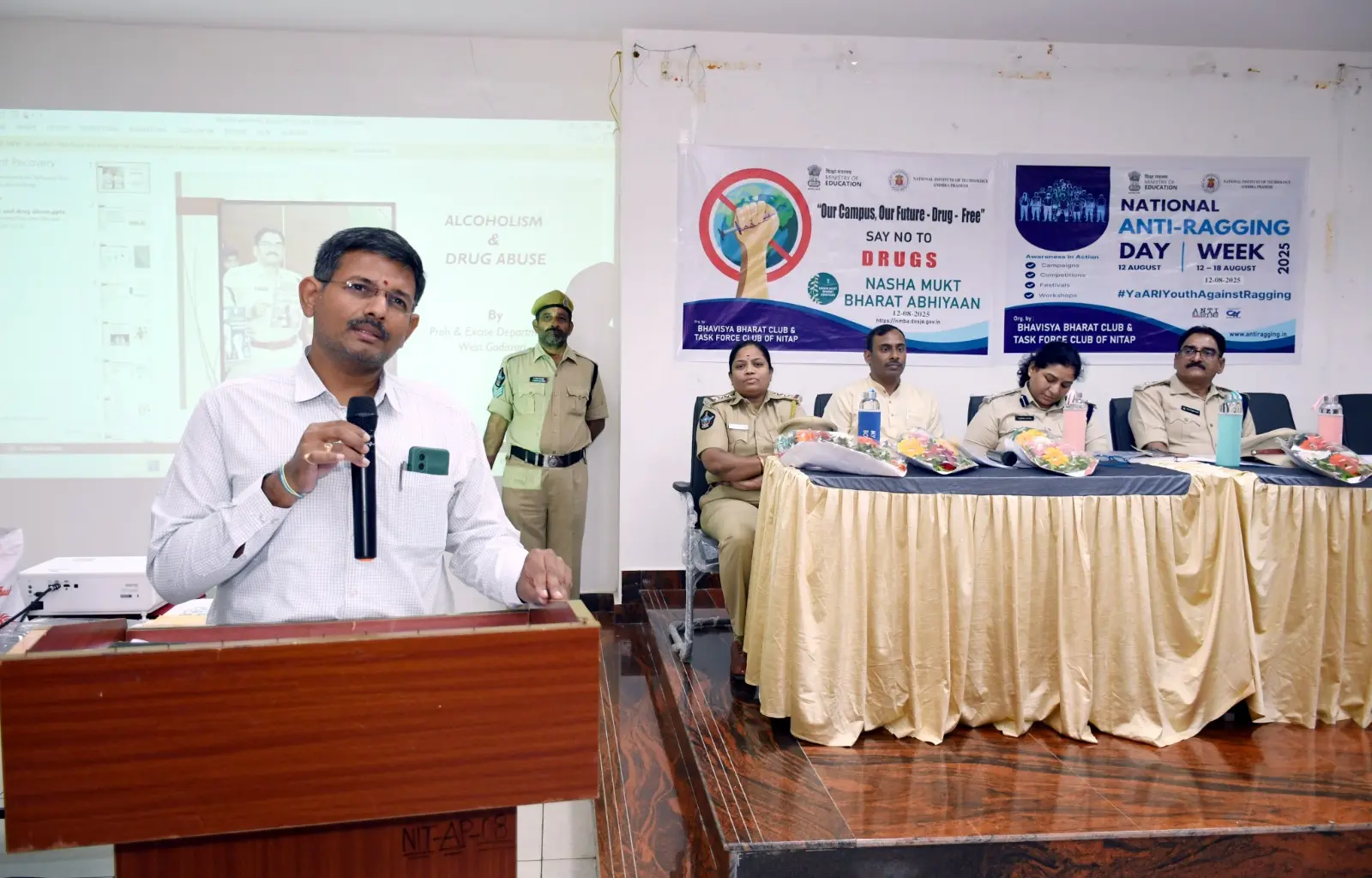 The Bhavisya Bharat Club of NIT Andhra Pradesh organized an awareness program on Anti-Ragging and Nasha Mukt Bharat Abhiyaan. Smt. Boyapati Sri Latha Garu, Sri KVN Prabhu Kumar Garu, and Sri Dharmavarapu Viswanath Garu addressed the students, encouraging them to help build a safe and drug-free campus.