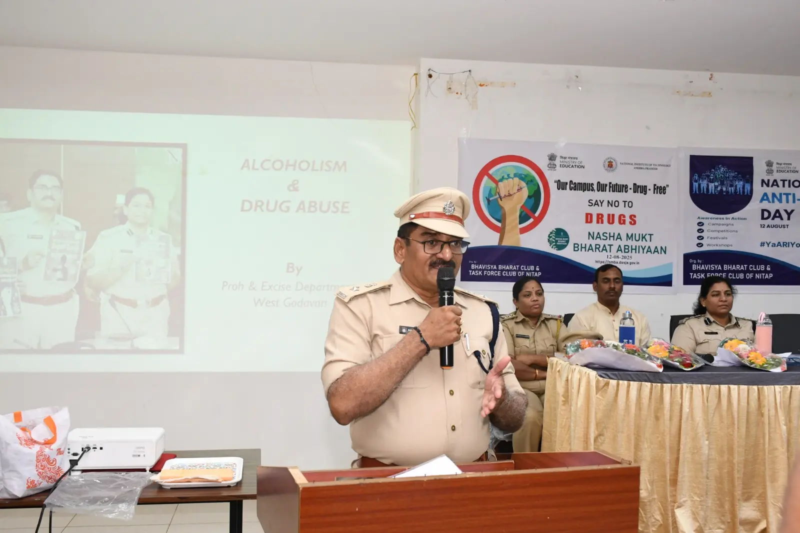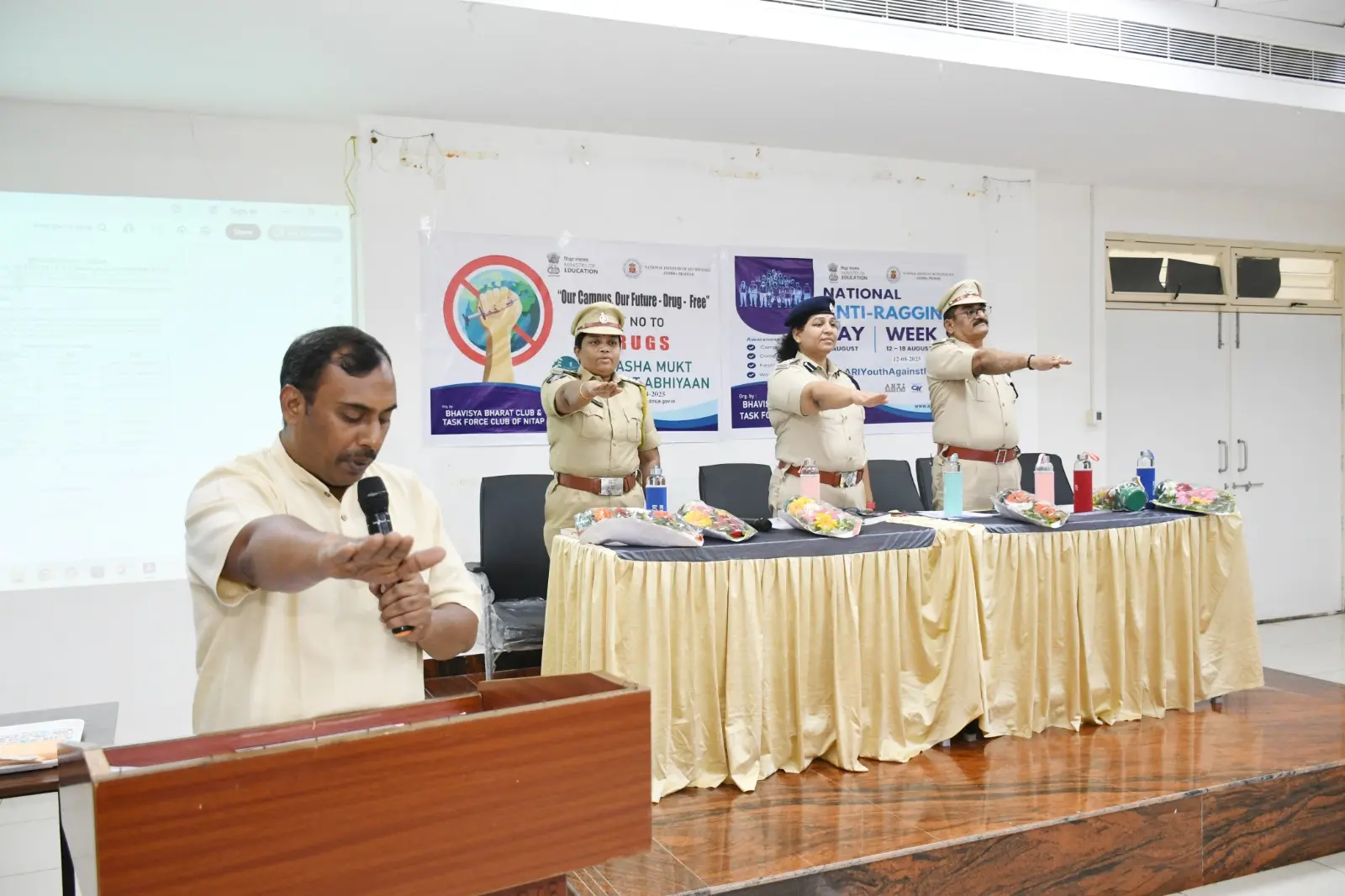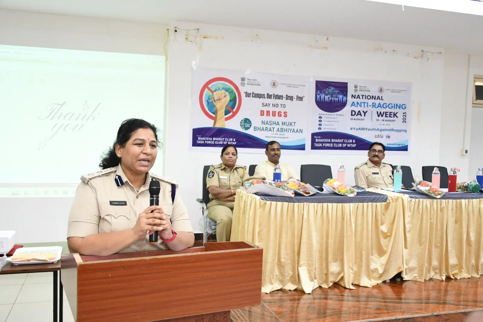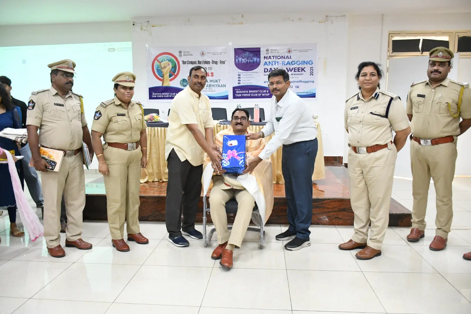 The Bhavisya Bharat Club of NIT Andhra Pradesh organized an awareness program on Anti-Ragging and Nasha Mukt Bharat Abhiyaan. Smt. Boyapati Sri Latha Garu, Sri KVN Prabhu Kumar Garu, and Sri Dharmavarapu Viswanath Garu addressed the students, encouraging them to help build a safe and drug-free campus.